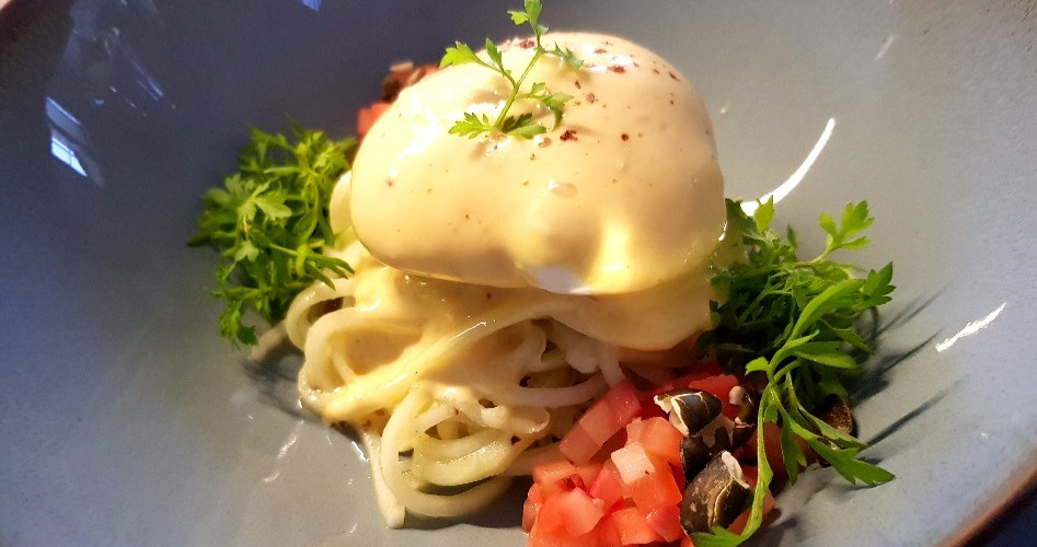 Pochiertes Ei | Misohollandaise | Kohlrabispaghetti | Radieschensalat